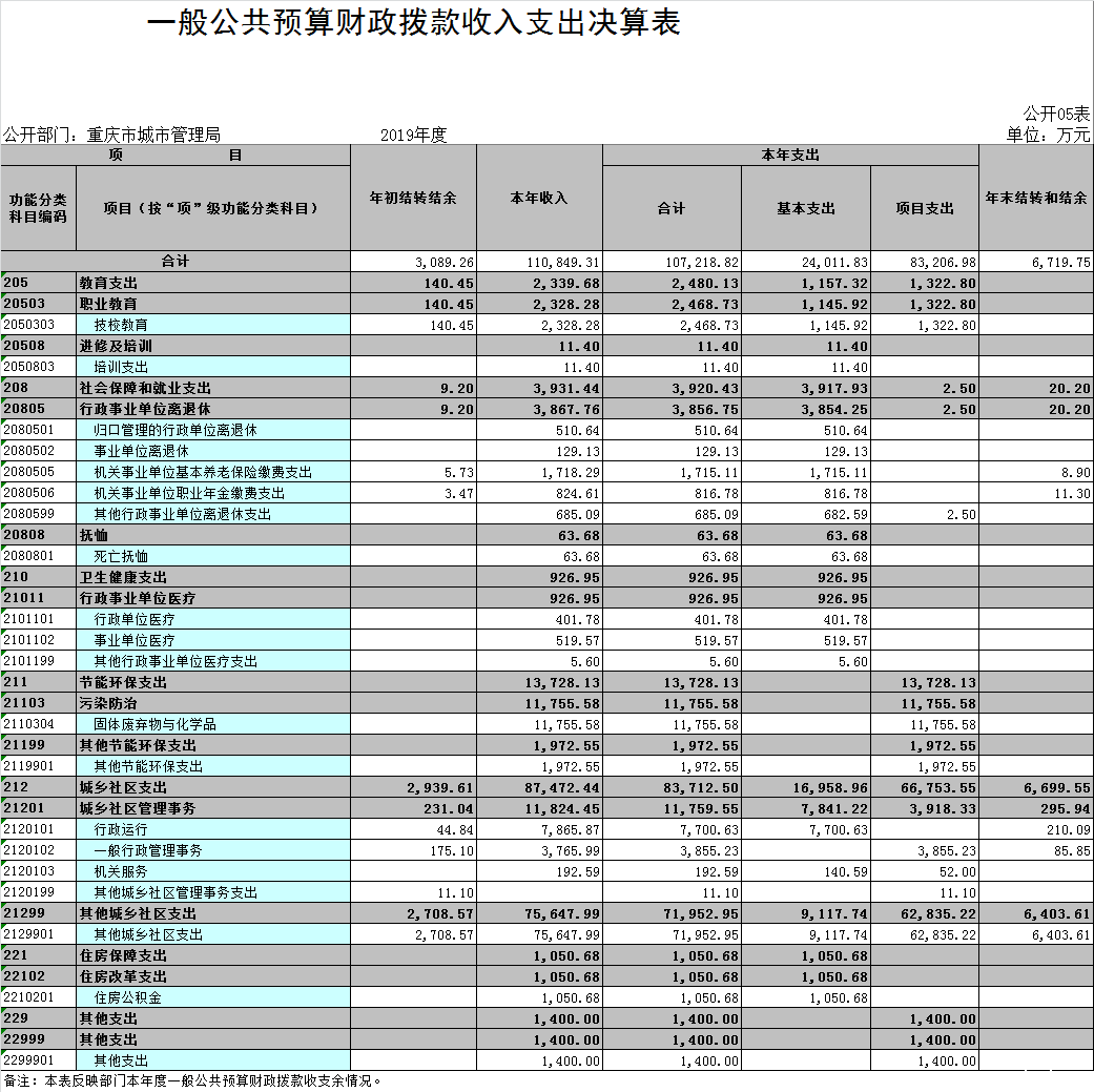 1.总体情况。2019年度收入总计161,693.97万元,支出总计161,693.97万元。收支较上年决算数增加37,245.93万元、增长29.93%,主要原因是在于机构改革,重庆市市政管理委员会与重庆市园林事业管理局撤销,共同组建重庆市城市管理委员会,于2018年10月按市政府要求更名为星空游戏官方网站入口,此次决算中上年决算数的本级及系统数据是以重庆市市政管理委员会2018年本级及系统数据为基础,未包含原重庆市园林事业管理局2018年本级及系统数据,因此2019年决算收支较上年决算数有较大变化。