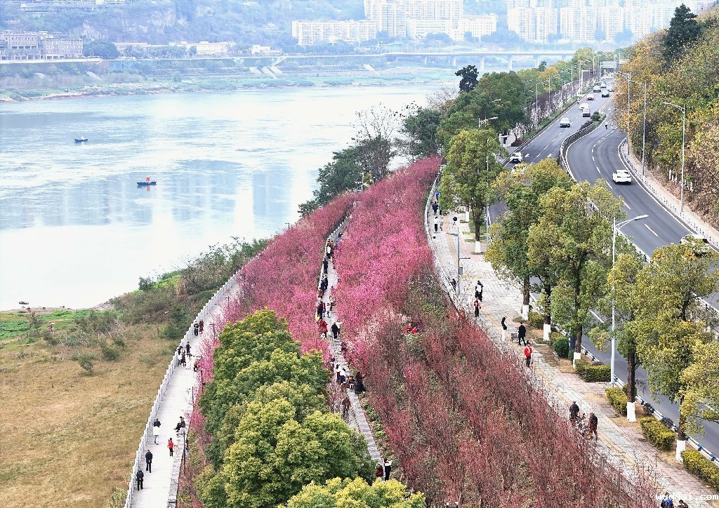 南岸区南滨路雅巴洞湿地公园,红梅花开正艳。数千株红梅在寒风中绽放,或舒展花瓣,或含苞待放,红的娇艳,粉的温润,如梦如幻,展现出蓬勃的生机与独特的魅力,吸引了众多游客前来观赏,成为冬日里一道亮丽的风景线。