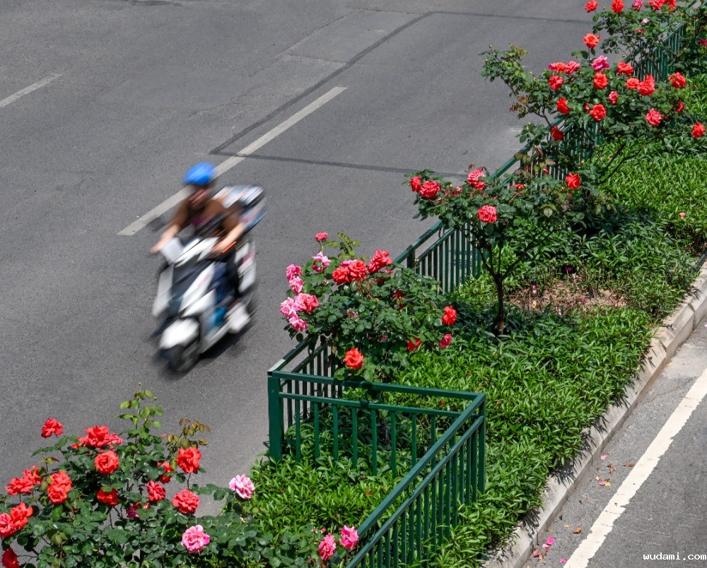 ▲4月20日,江北区海尔路,道路隔离带中盛开的月季花迎风招展。