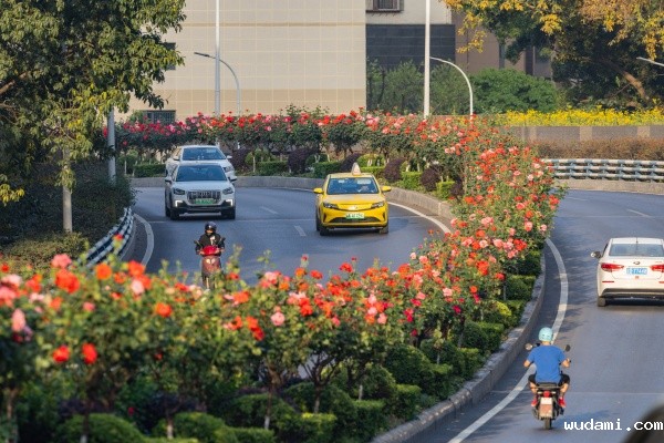 在长江一、二路沿线,隔离绿化带沿途的月季鲜艳夺目,尤其在高架桥上,一簇簇花骨朵娇嫩饱满,与树池中绿色的草木巧妙搭配,显得格外娇俏,形成空中花廊。车行其中,粉红、玫红等各色月季一路相送,鼻间拂过淡淡的清香,不觉让人心旷神怡。